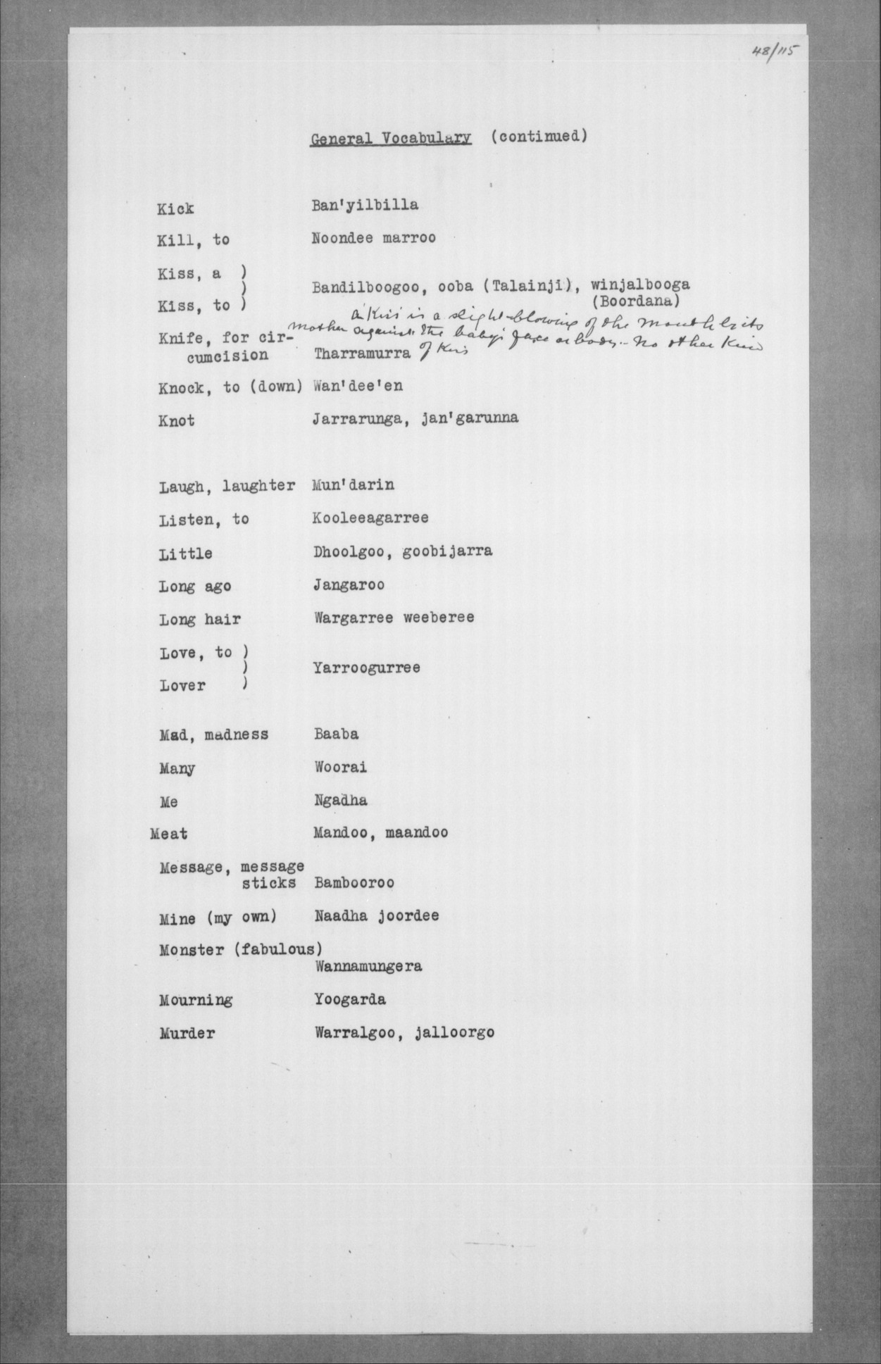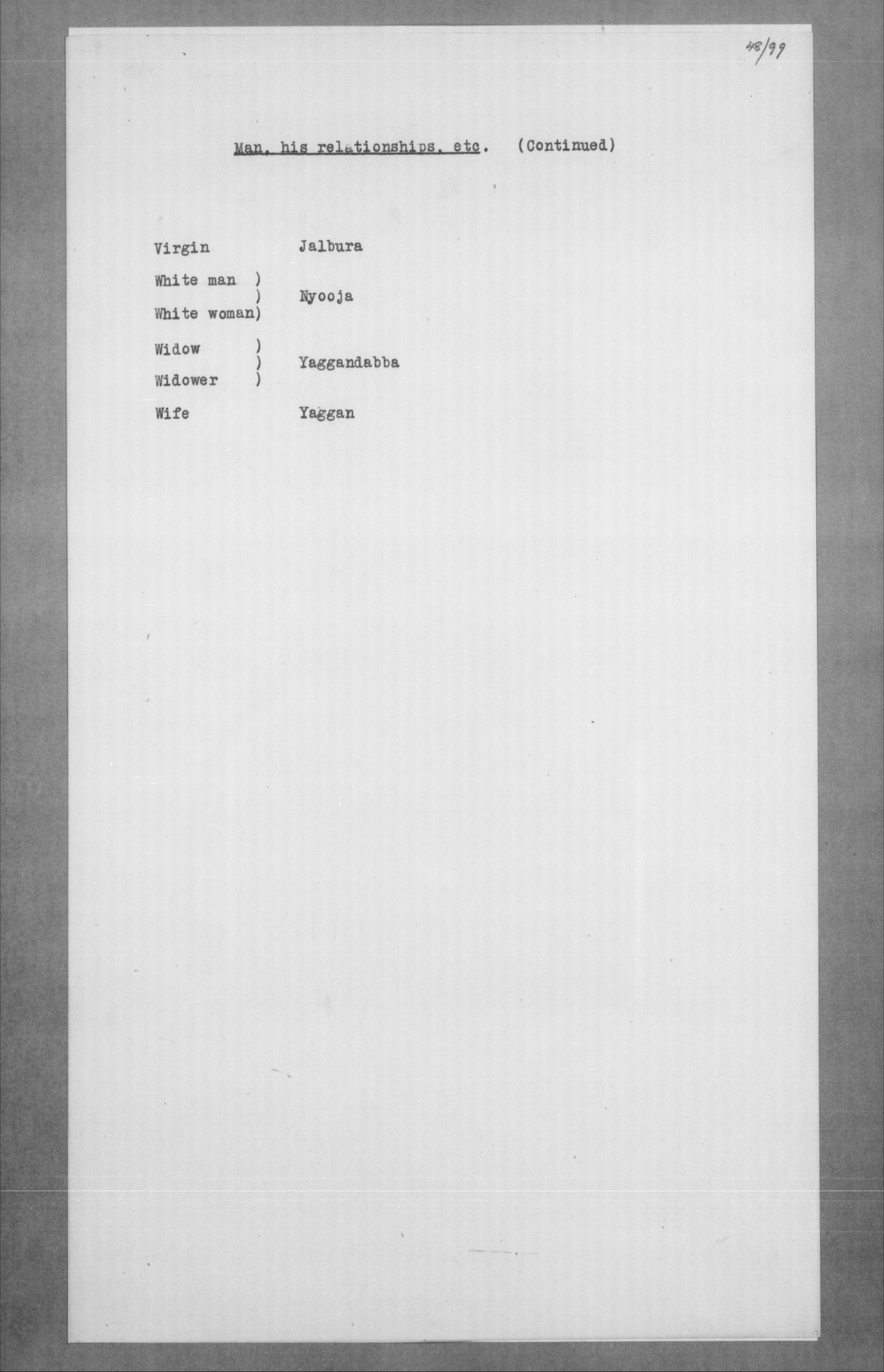 | Folio 48/96-129 XII 2D, 4a Talainji and Boordoona (Boodana) people Mardugabbaij or Jalgoorin (m) of Yabboongulla and Beebinjee, Weergagooroo (f), Bimbagooroo (f), Minderad, Baljugooroo (m). (Weergagooroo is Boordana and Wong-ngooroo or koordee (bandicoot) thaaloo and kooleet (cockatoo) thaaloo. Bimbagooroo is Talainji, jeerubardee thaaloo (porcupine) Jalgoorin is wanna or yoongoo (rain) totem, Talainji Near Naroo Station Ashburton Magisterial District |