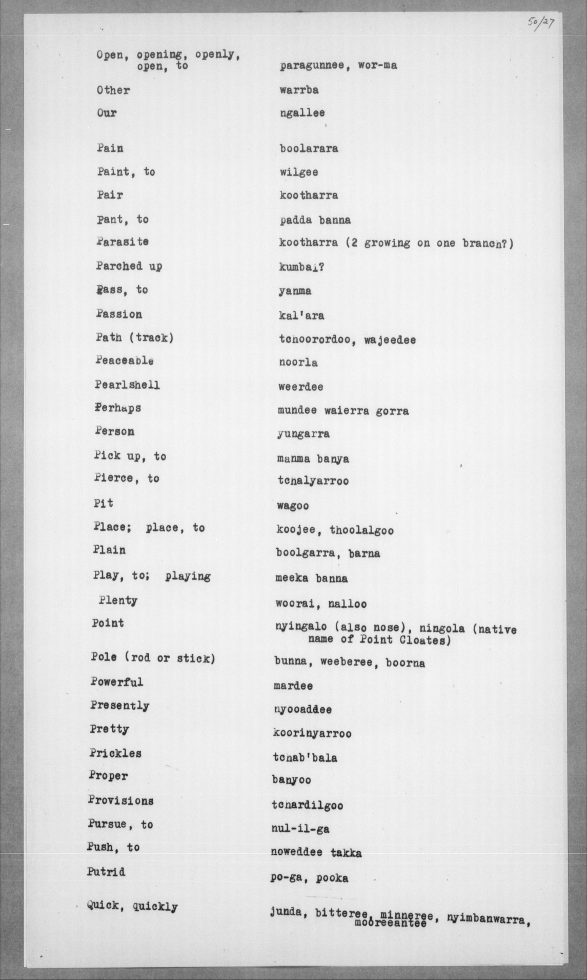 | T. Carter - Point Cloates J.H. Monger - Gascoyne Edward Cornally - Gascoyne & Ashburton T.L. Richardson - Gascoyne Rev. E.R. Gribble - Gascoyne River Folio 50/1-44 XII 2D, 12 T. Carter, Point Cloates J.H.T. Monger, Weeda Station, GascoyneEdward Cornally, Wandajee Station (Gascoyne & Ashburton) T.L. Richardson, Gascoyne Rev. E.R. Gribble, Gascoyne River These vocabularies may be compared with those obtained from natives themselves. They are interesting as showing the different marmen in which each while man intergrated the native Sounds, but they showed the necessity of having a simple uniform system of orthography & applying it to all dialects obtained direct from the natives themselves. In this connection, the marginal words & sentences in various vocabularies which were voluntarily tendered by the natives are very valuable to the philologist as they give the native construction of sentences - ect., Edward Cornally lived for many years amongst the natives of the areas he shepherded & in the course if his duties as shepherd his friendly & brotherly association with every native groups enabled him though all illiterals man to exercise his natural gifts in connection with the lives, law, customs etc. of the natives. This task helped his employees throughout his shepherding career - as his "adoption' by the native groups & his strict adherence to their laws reporting their woman brought safely to the flocks sherds of his white masters. |