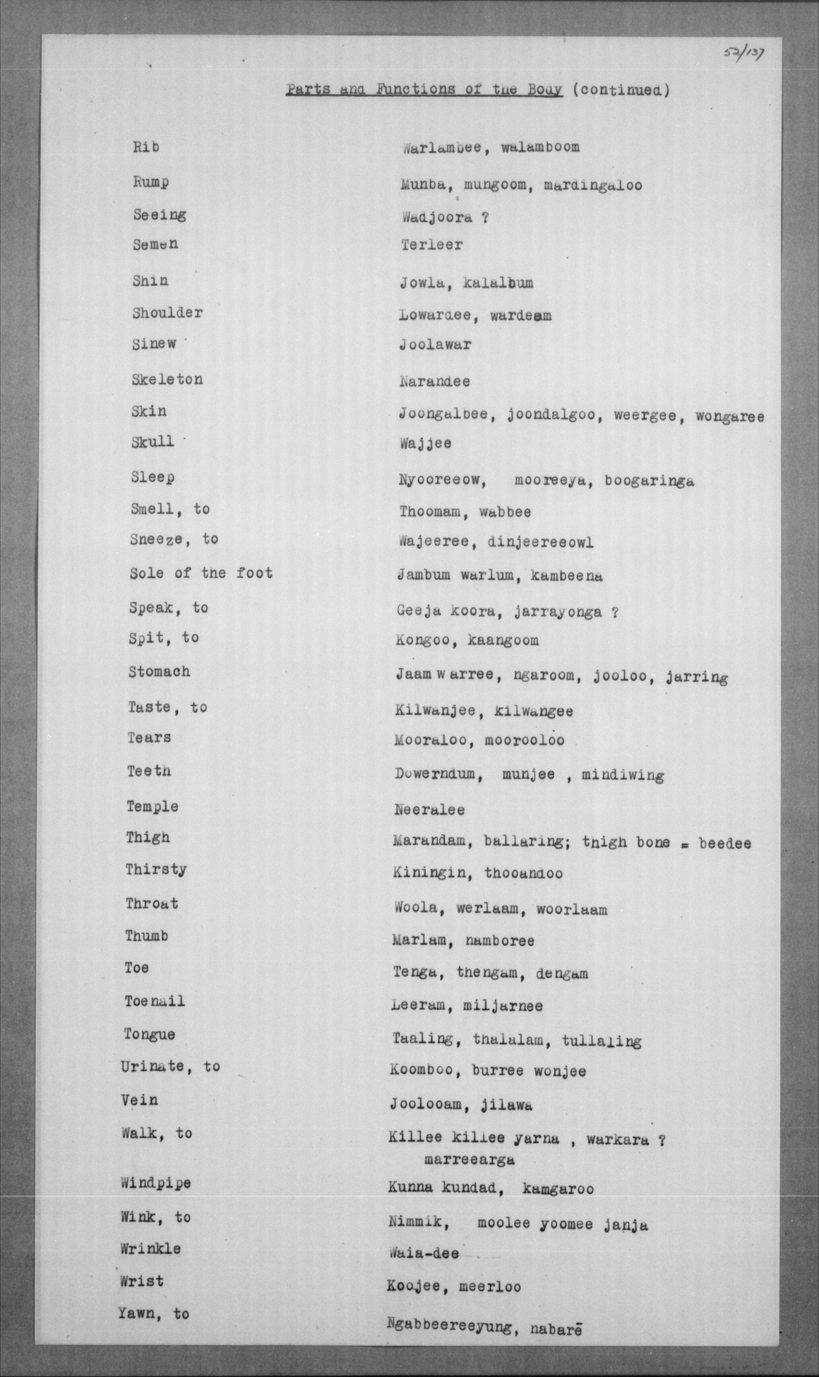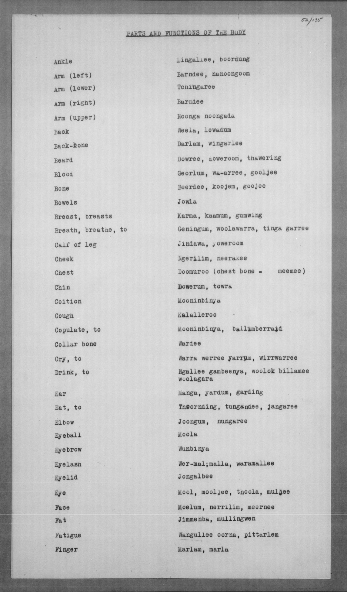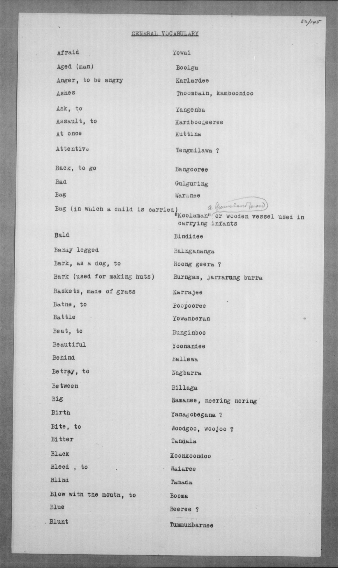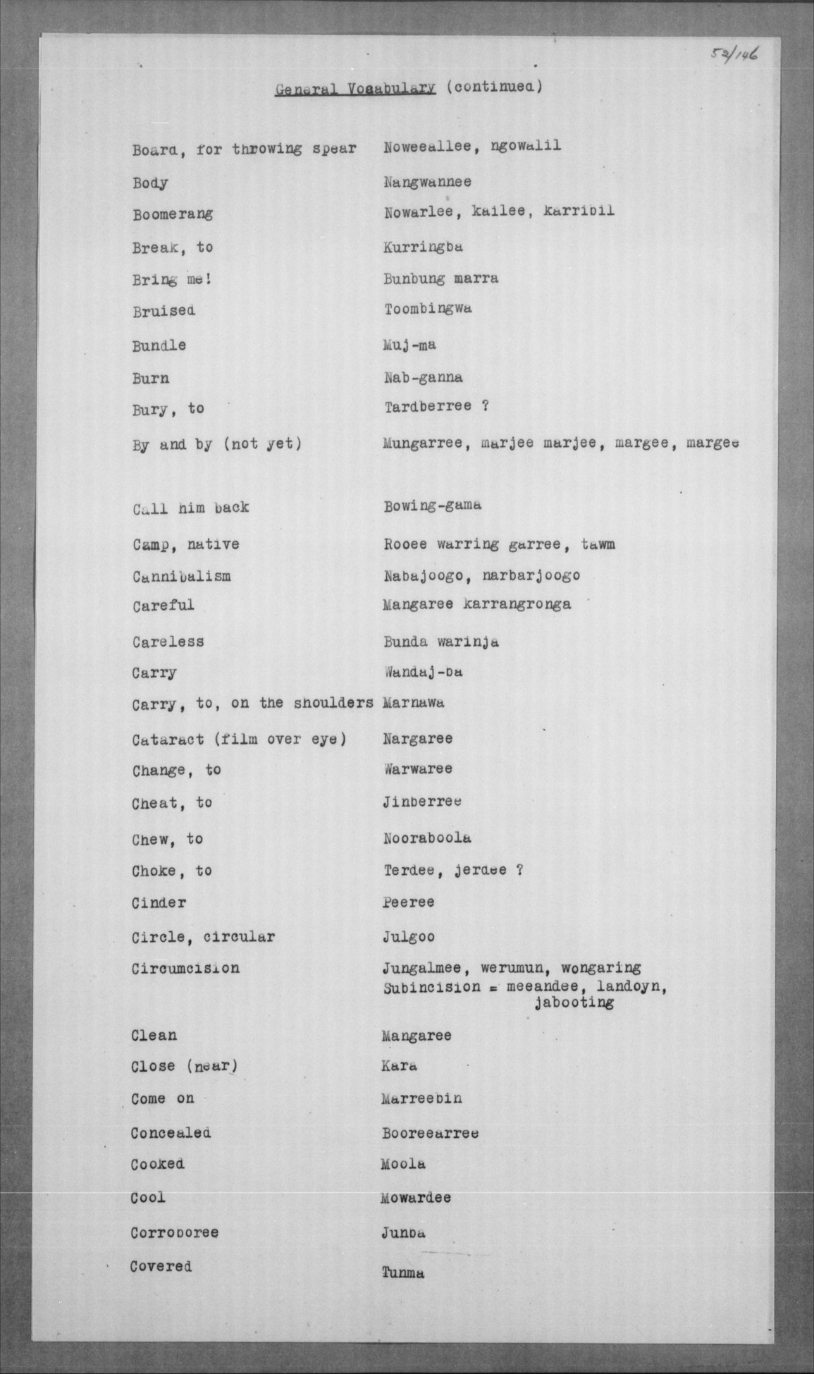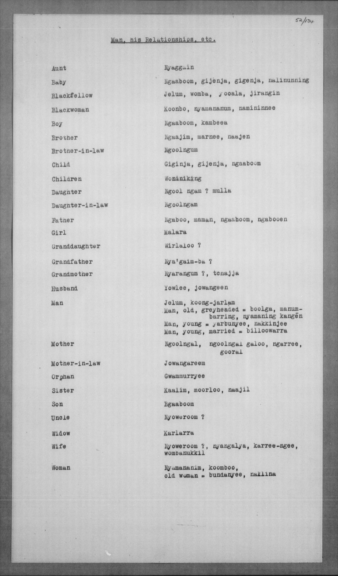 Jelum, koong-jarlam Man, old, greyheaded = boolga, manumbarring, nyamaning kangēn Man, young = yarbunyee, nakkinjee Man, young, married = billoowarra |