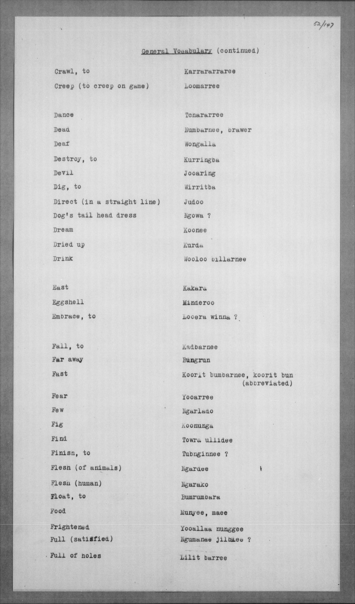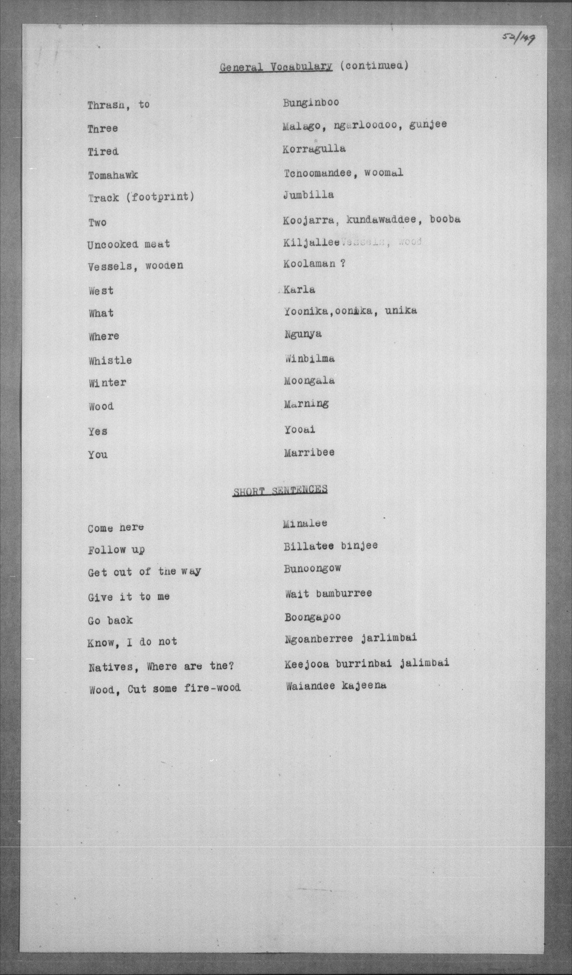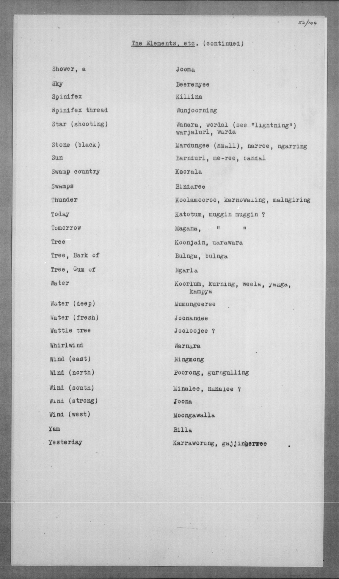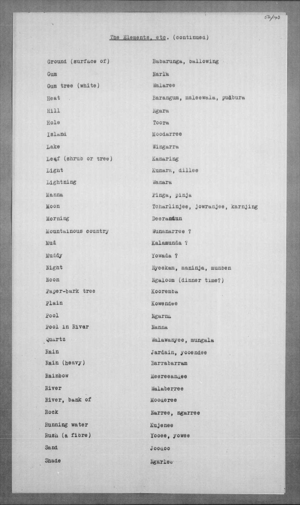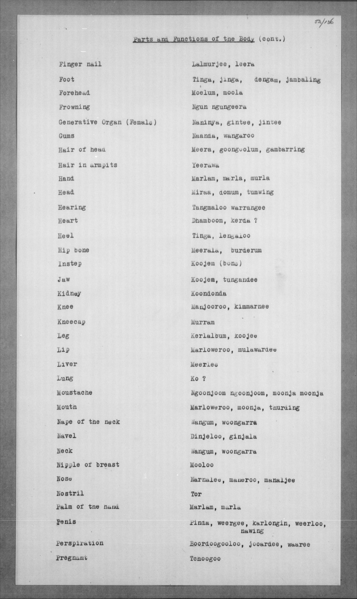 Jelum, koong-jarlam Man, old, greyheaded = boolga, manumbarring, nyamaning kangēn Man, young = yarbunyee, nakkinjee Man, young, married = billoowarra |