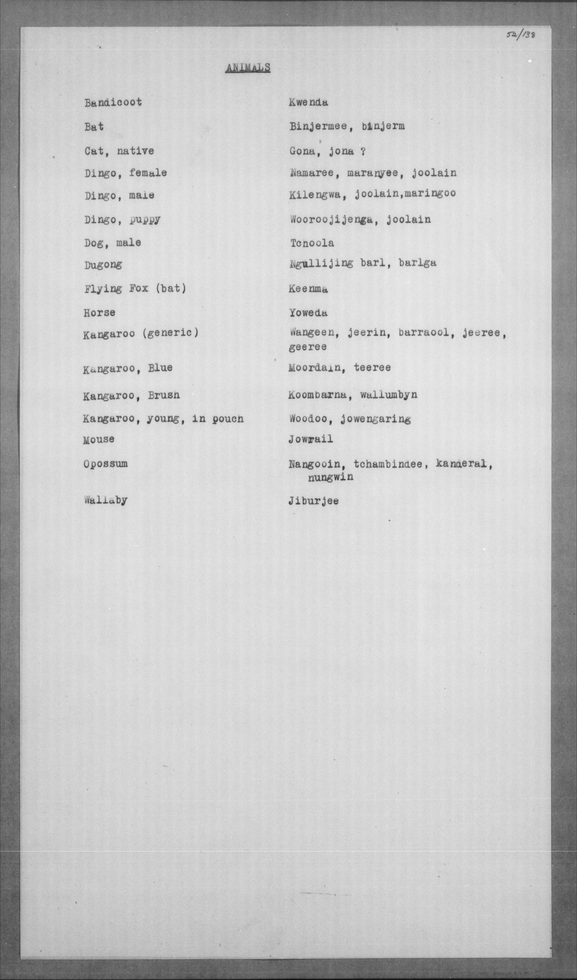 Jelum, womba, yooala, jirangin |