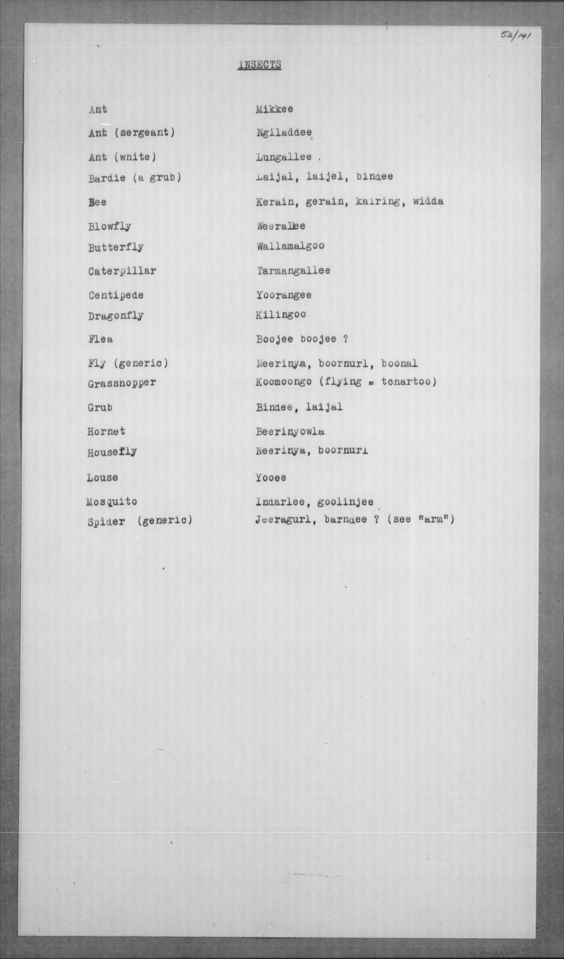 Nyamananim, koomboo, old woman = bundanyee, nallina |