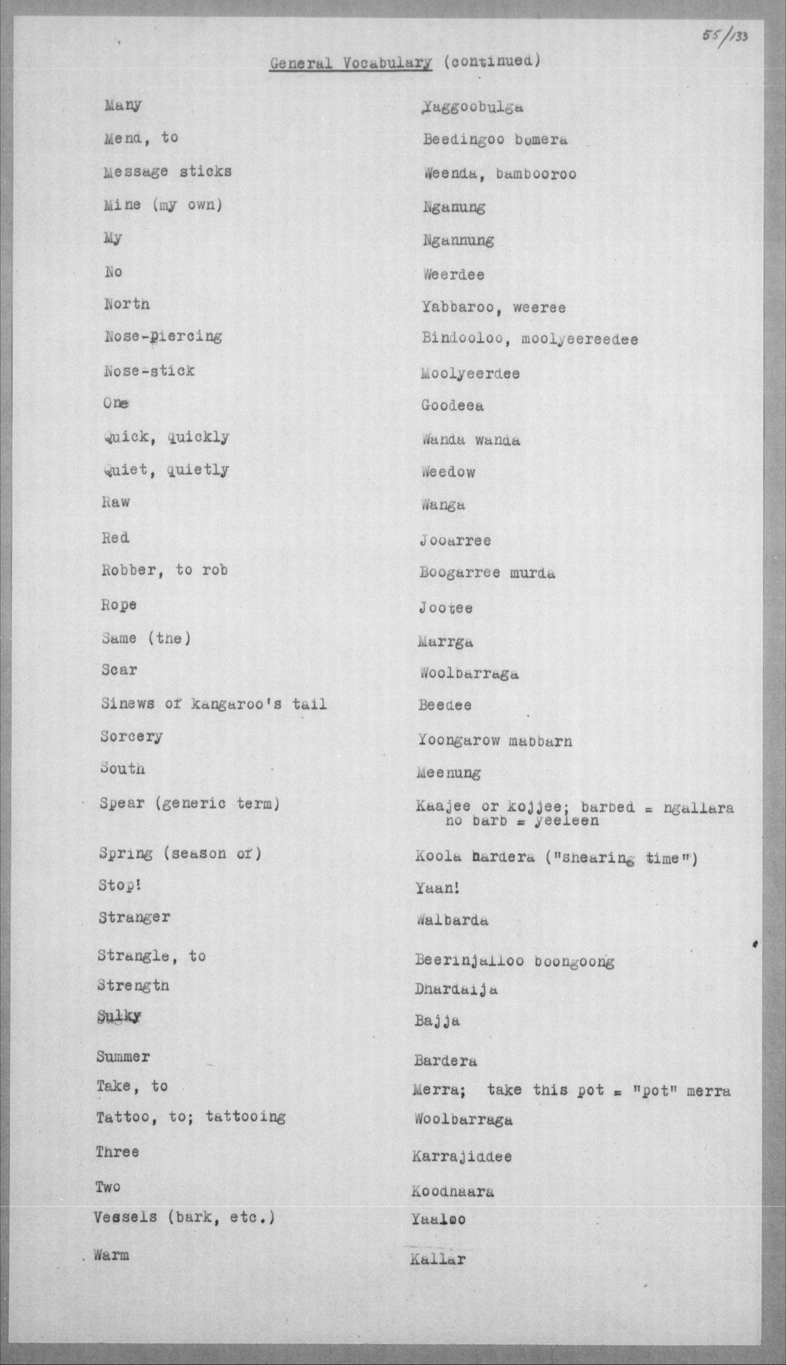 | 2. Names of weapons, implements and domestic utensils? | Kaajee, meeroo, wammooroo - hammer, wammooroo - knife, walanoo, -kailee, koondee - club. |