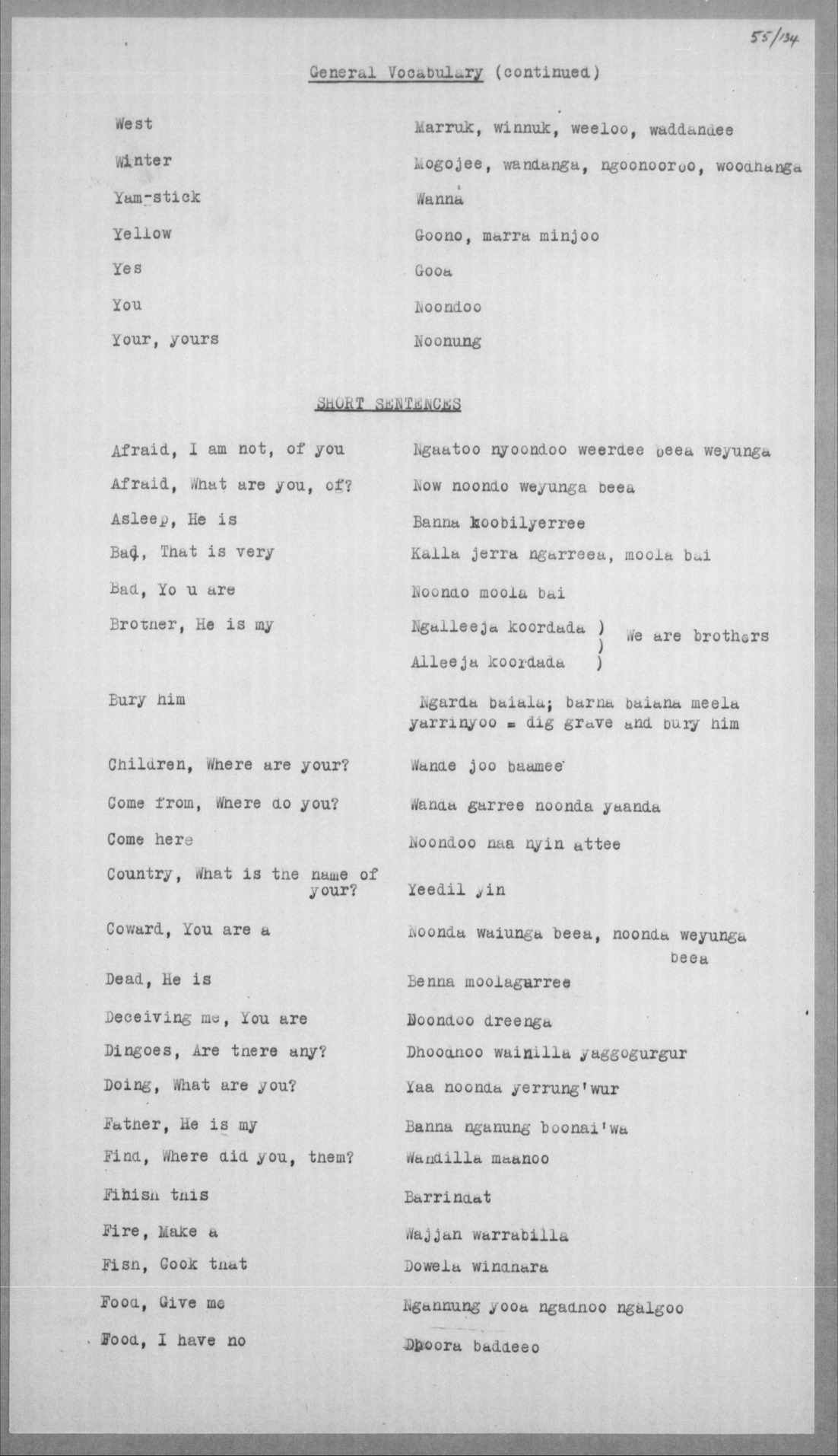 Folio 55/122-139 XII 2F, 13 Wering or Weerding Of Doodambarring, (Yeedeling,) Mingaburdee, Eedelyee, all "Yabbaroo way" Murchison Magisterial District Yeera kooteea wanganya = one mouth speech |